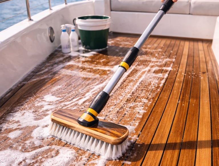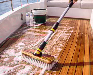 Limpieza y restauración básica de cubierta de teca con productos específicos para proteger la madera, recuperar el tono natural y evitar el desgaste. Ideal para mantener un acabado premium sin dañar el material.
